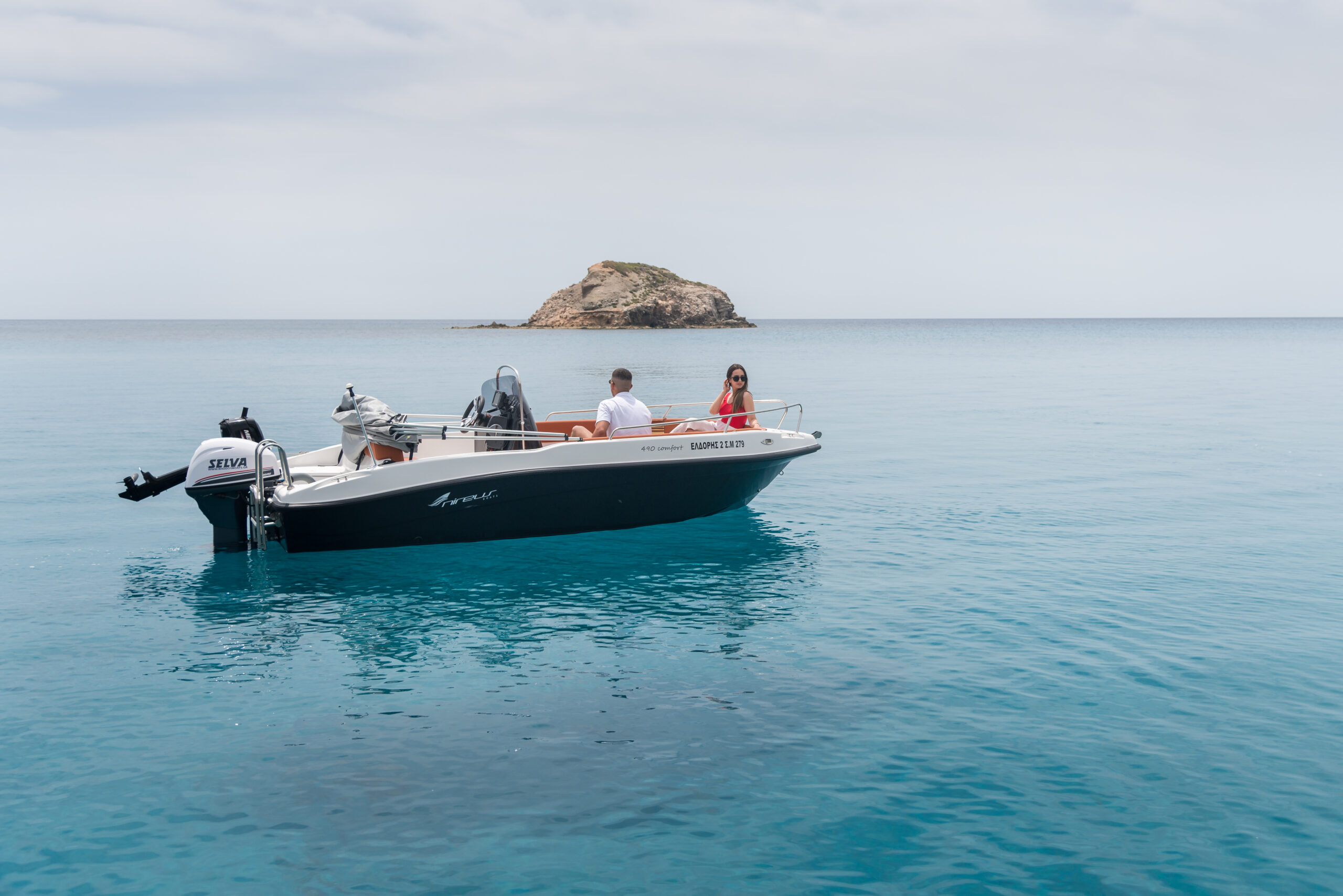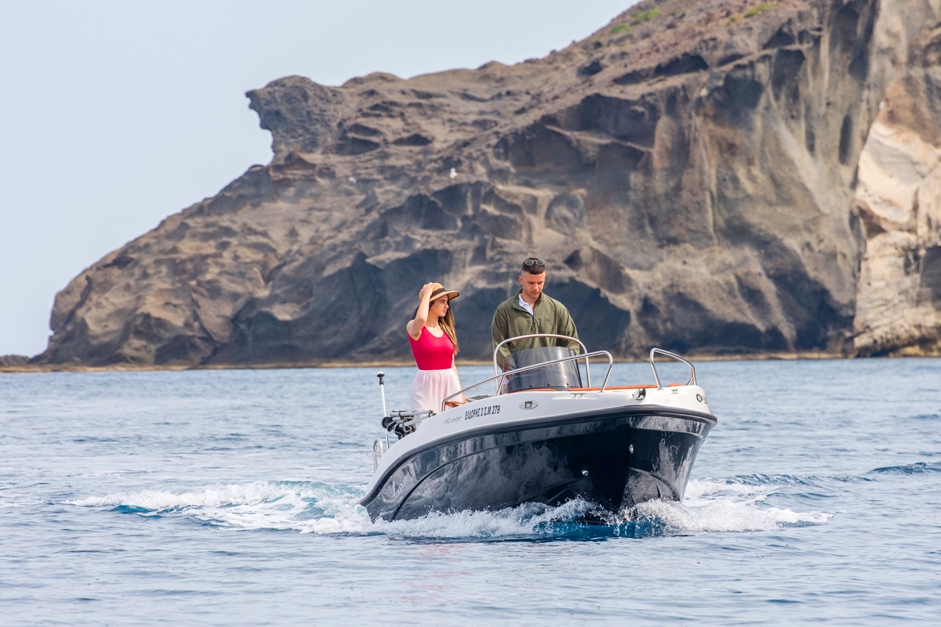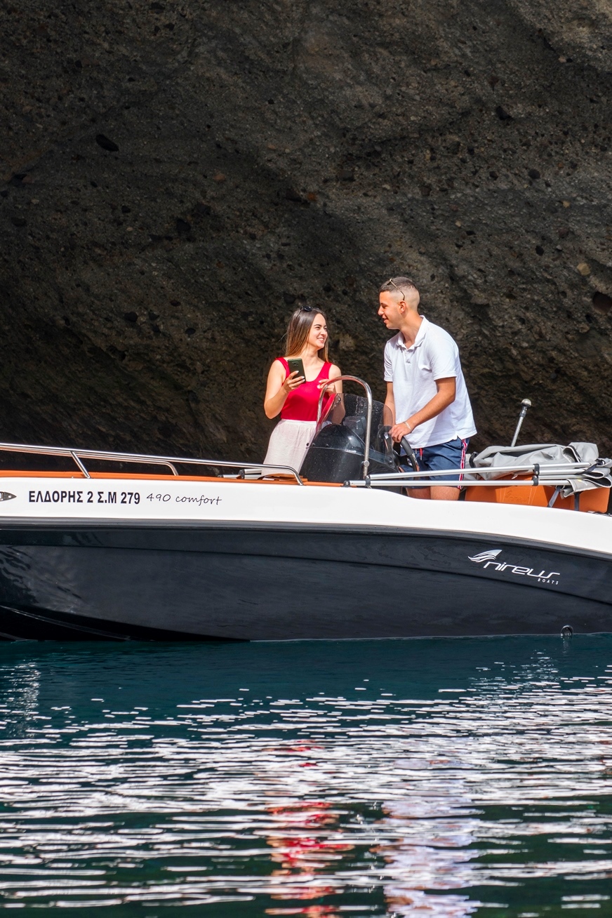 The Eldoris 2 – Nireus 490 Comfort boat in black color is the perfect vessel for exploring the stunning waters of Milos Island in Greece. With its sleek and stylish design, this boat is perfect for those who want to travel in ultimate comfort and style. The boat features comfortable seating and a large sun deck, making it ideal for a day of water sports or just relaxing in the sun.